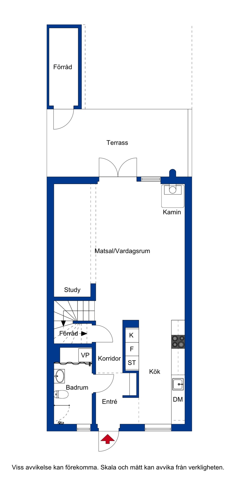 I en öppen planlösning mot matplats och kök finns vardagsrummet. Här finns en fin kamin med utvändig skorsten och ett platsbyggt skrivbord för läxläsning eller hemmakontor. Från vardagsrummet finns utgång med dubbeldörrar mot baksidan till den fantastiska utemiljön med stort trädäck och tomt i direkt anslutning till naturen.