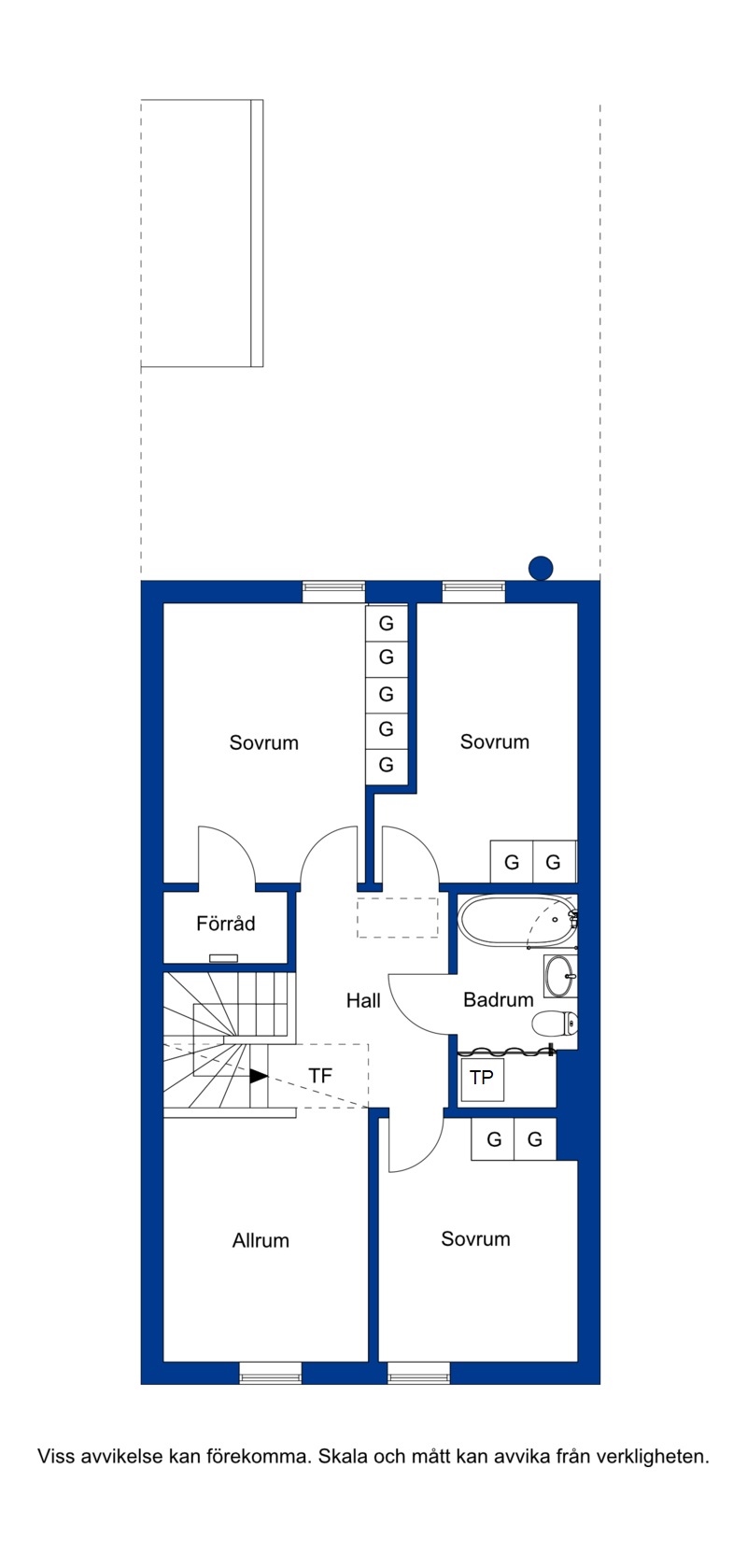 En vacker trappa i mörkt grön nyans leder upp till övervåningen och dess allrum. I taket ovan trappen finns ett trevligt fönster som sprider fint ljus, både i trappen och till allrummet. Önskas fyra sovrum i huset går allrummet att dela av.