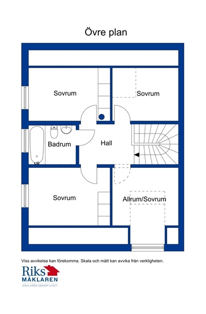 Huset har genomgående målade väggar i vitt förutom sovrum 1 som är målade i en mörkt blågrå ton. Genomgående vitlaserade trägolv.