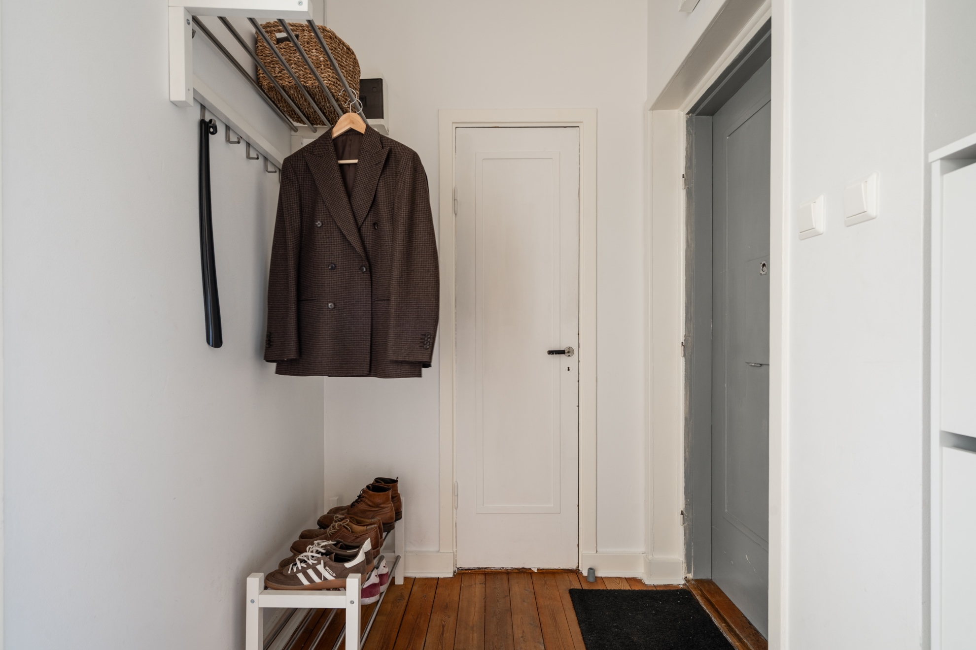 Hall med klädkammare intill ytterdörren, den inre delen av hallen utnyttjas som sovalkov. Rummet har högt i tak, trägolv och vitmålade väggar.