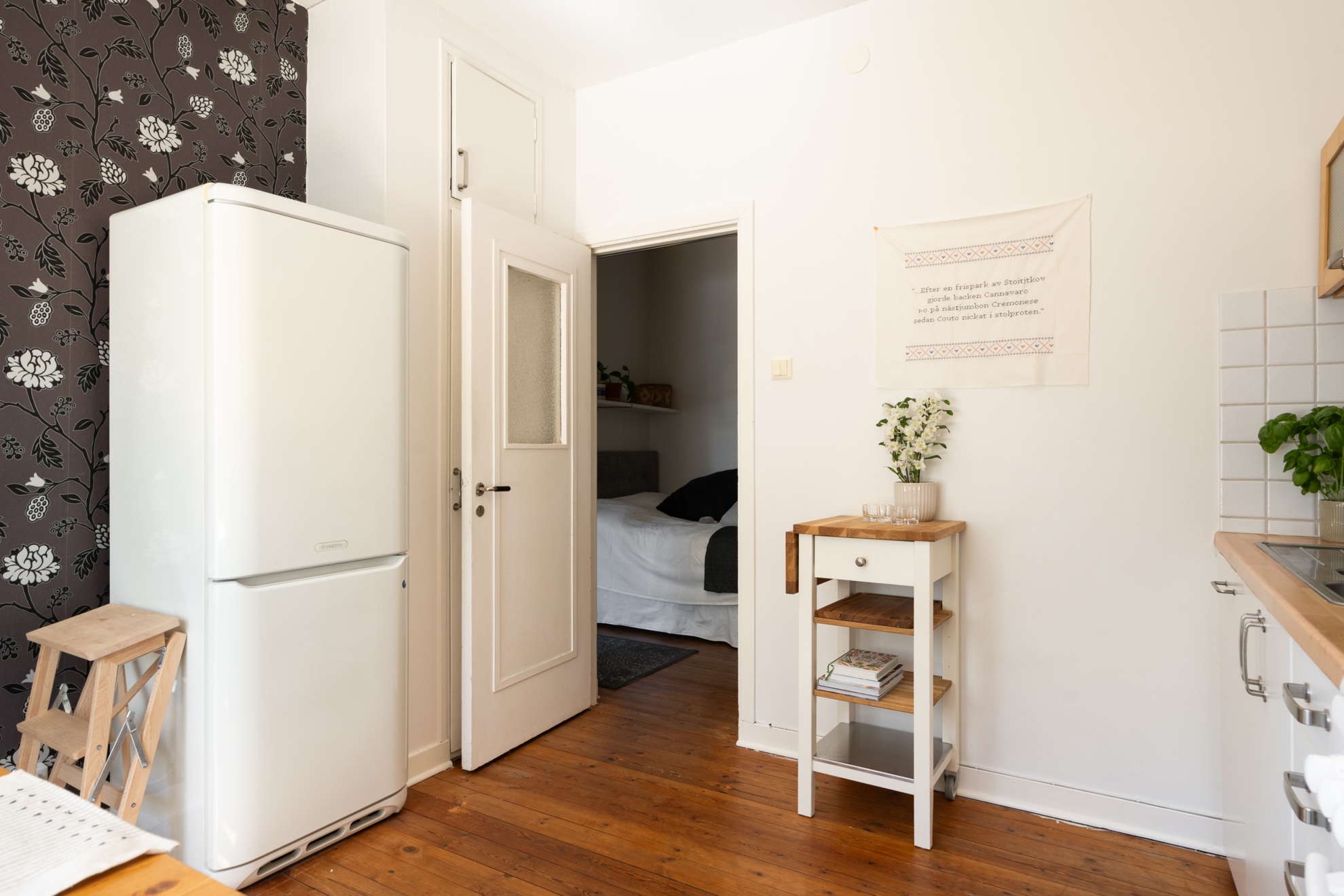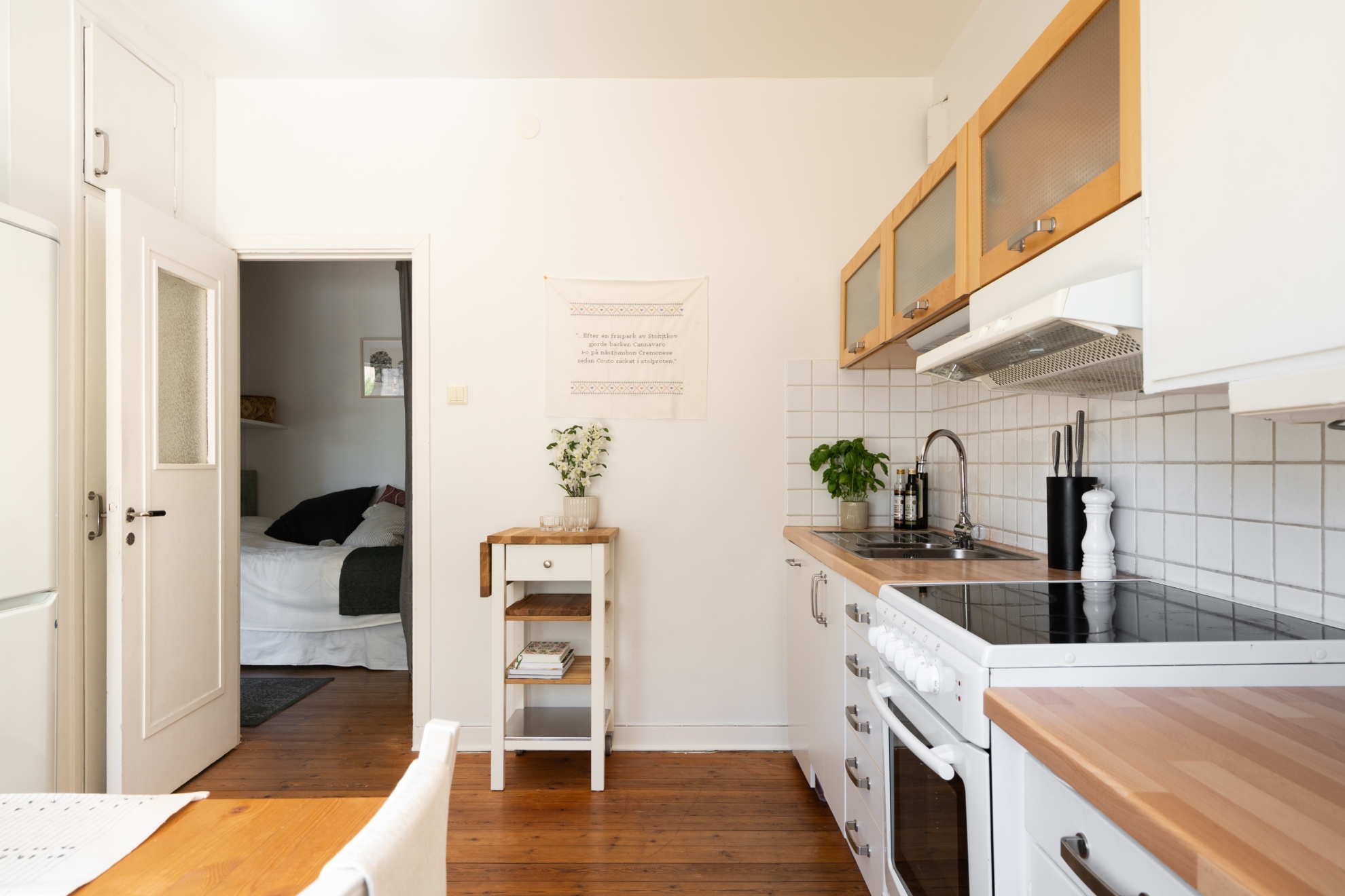 Ljust och luftigt kök med en rymlig matplats och gott om förvaring i flertalet skåp. Här finns även ett städskåp med ett tillhörande överskåp. Köket är utrustat med kyl/frys, diskmaskin, spis, spisfläkt. Trägolv och ljusa väggar.