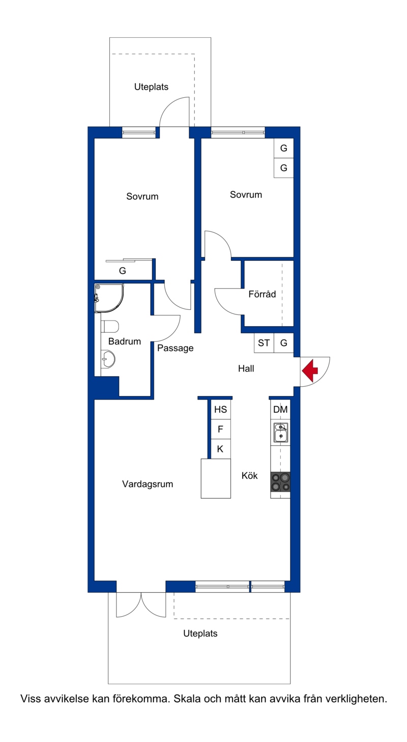 Rymlig hall med gott om plats för både avhängning och förvaring i byrå eller garderober. Direkt intill hallen finns dessutom ett praktiskt och större förråd – perfekt för att hålla hemmet snyggt och organiserat.