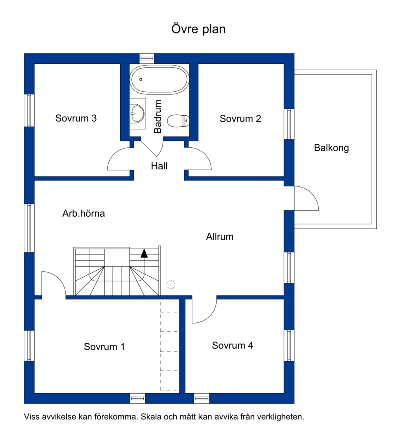 En trappa upp når ni allrummet som kan möbleras med soffa och TV-möbel och blir en perfekt plats för barnen att samlas för att se en mysig film. Här finns även utgång till balkong med härligt söderläge som ger sol hela dagen. Garderobsvägg i hallen med extra förvaringsmöjligheter. AC finns installerat som både värmer och kyler.