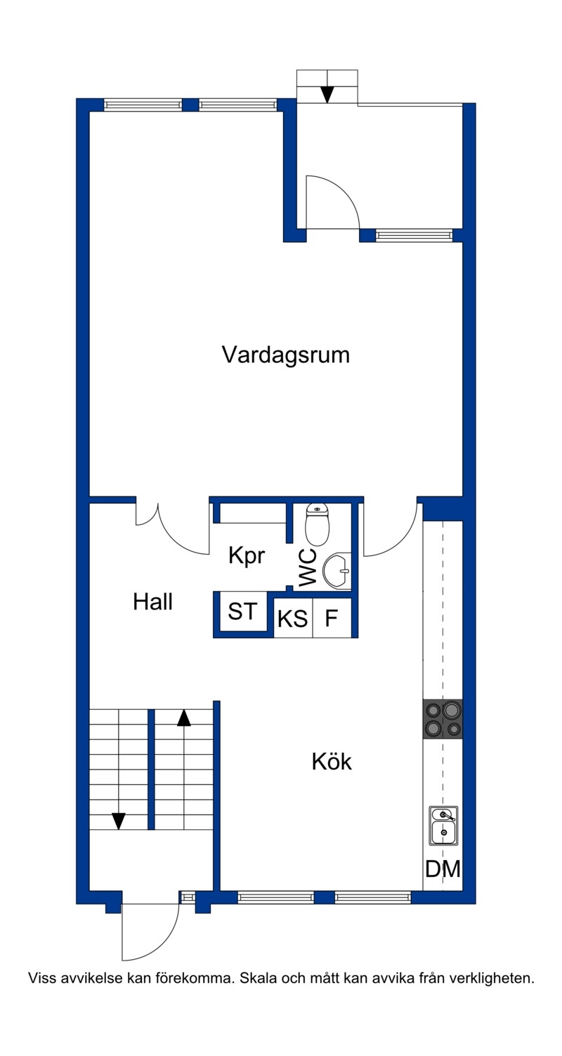 Intill hallen ligger en fräsch och ljus gästtoalett i direkt anslutning till kapprummet. Den är utrustad med toalett, handfat och spegel med belysning. Klinkergolv och ljusgrå målade väggar, med klinker som stänkskydd ovanför handfatet.