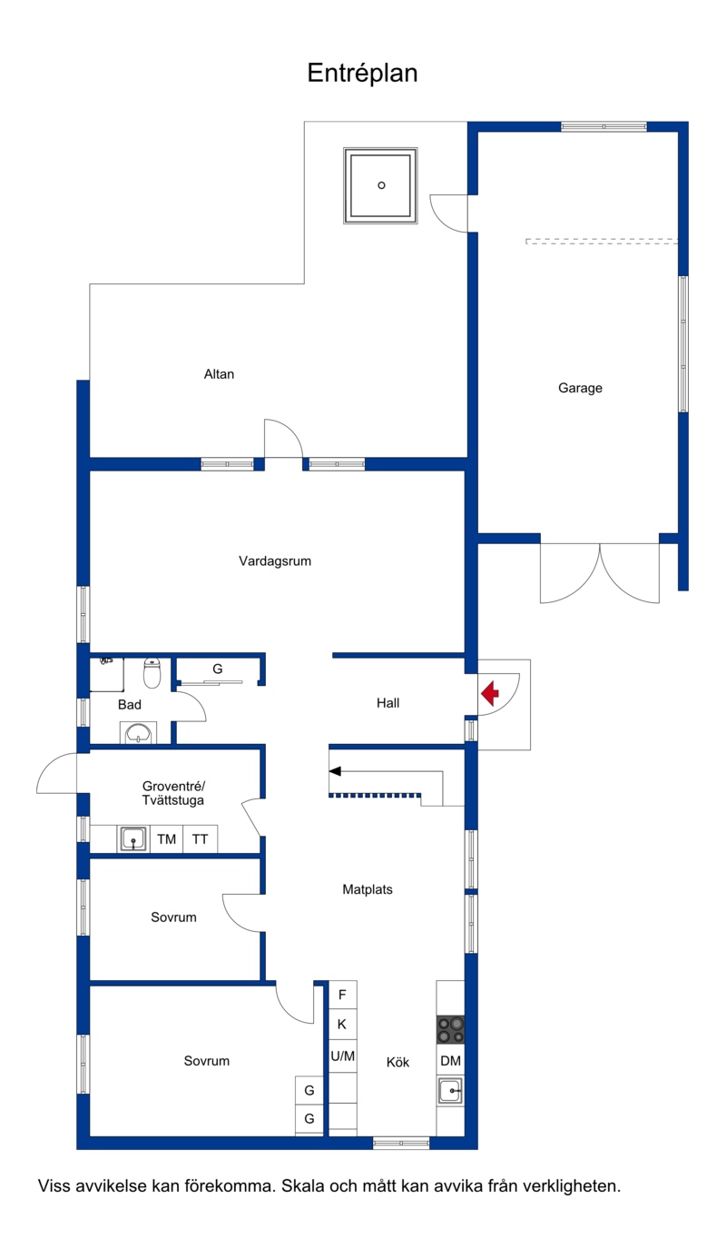 Med utgång från vardagsrummet nås ett stort altandäck där du kan njuta av sol på eftermiddagen och kvällen. I trädgården finns även ett härlig soldäck med pergola, hit når solen hela dagen.