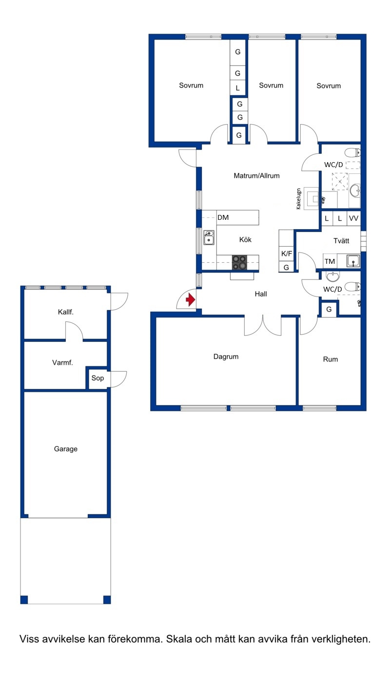 Två förråd finns bakom garaget.