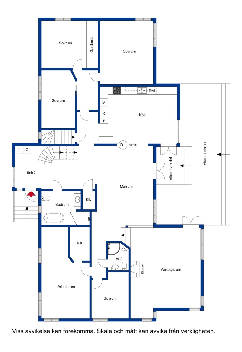 Öppen och social planlösning med matsal placerad mellan kök och vardagsrum. Plats för stort matbord. Vita väggar och massivt ekgolv. Öppen spis i vardagsrummet. Två utgångar till altan och trädgård. Nivåskillnad mellan matsal och vardagsrum som binds samman med trappa.