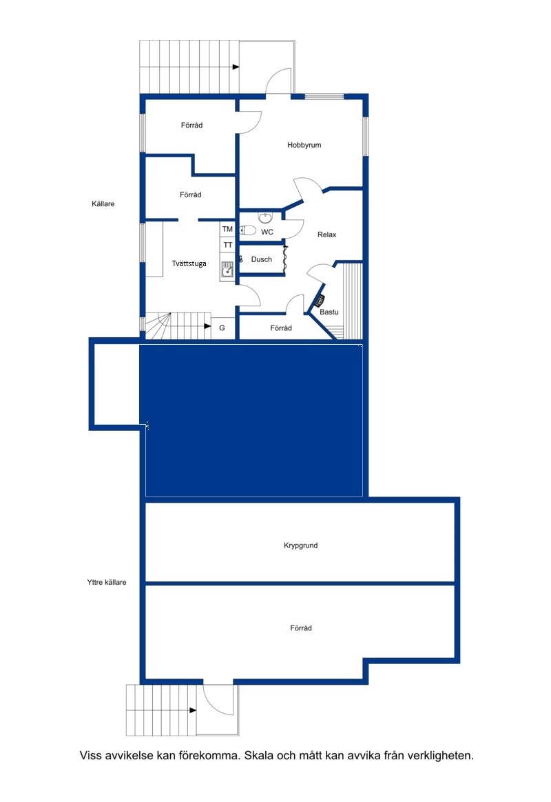 Förråd i källartrappa med förvaringsutrymme i krypgrund, delvis med ståhöjd.