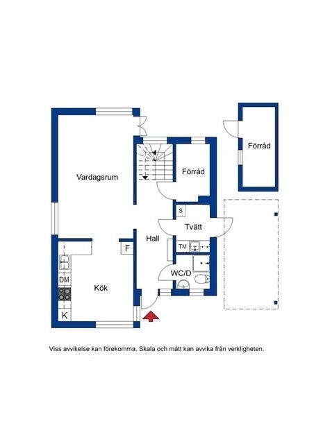 Plastmatta och vita väggar. Tvättho, tvättmaskin, torktumlare, städskåp samt grovingång.